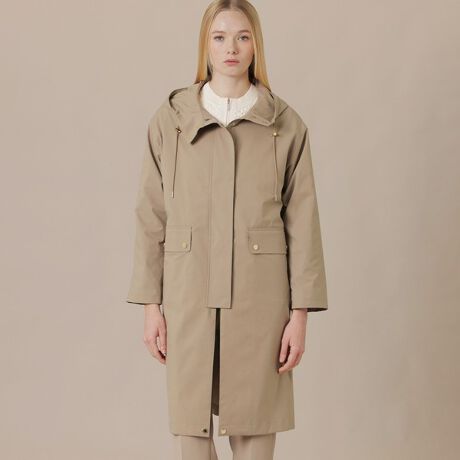 身頃の内側にドット釦が格納されており、裾を折り曲げ止めることでショート丈のブルゾンにもなるコートです。気温の変化やスタイリングでレングスのアレンジが可能です。軽量な素材で着心地の良いアイテムです。