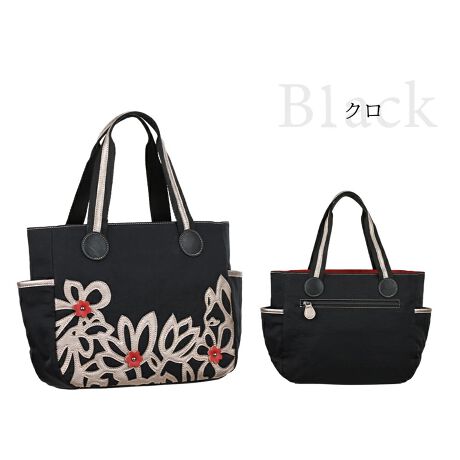 撥水加工の軽量ナイロンにメタリックの合皮の花柄のモチーフカットワークが特徴なトートバッグ。