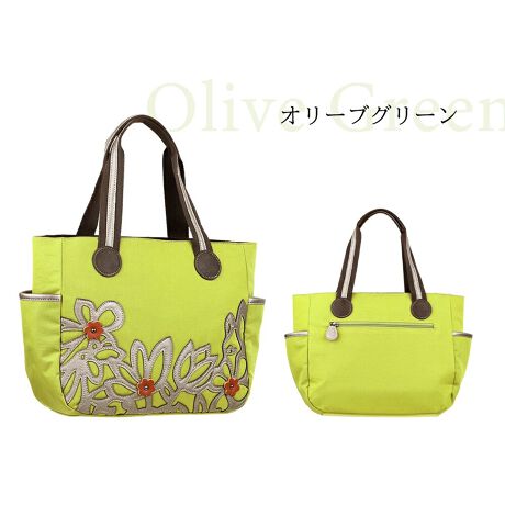 撥水加工の軽量ナイロンにメタリックの合皮の花柄のモチーフカットワークが特徴なトートバッグ。