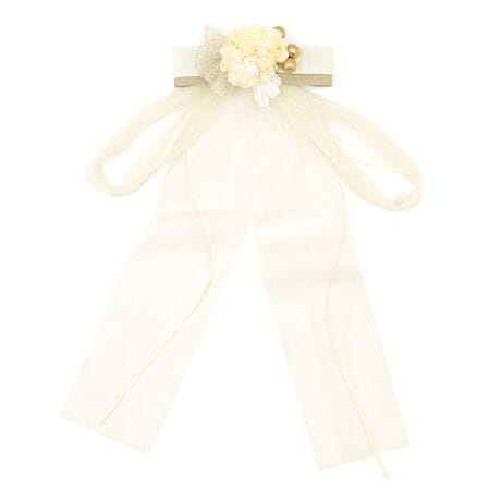 柔らかな生地のドライフラワー調の花、艶やかなフェイクパール、グログランリボンや透け感のある長いチュール生地が可愛いデザインです。