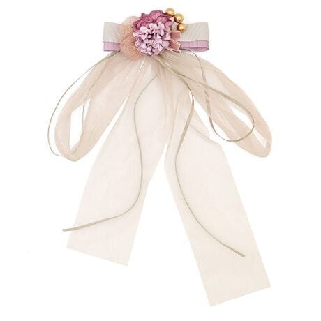 柔らかな生地のドライフラワー調の花、艶やかなフェイクパール、グログランリボンや透け感のある長いチュール生地が可愛いデザインです。