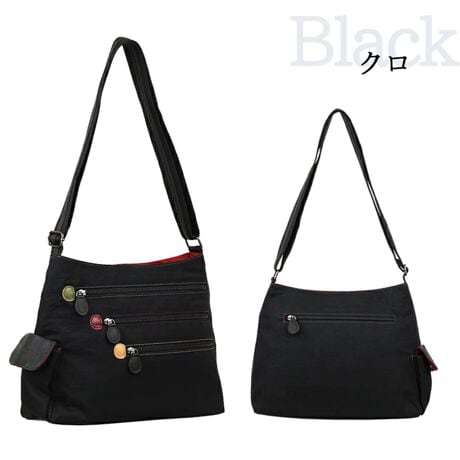 レインボーのようなカラフルなドットポイントに、収納ができるファスナーポケットがたくさん付けている多機能ショルダーバッグ!