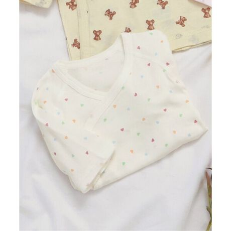 [型番:V237036]apres les cours(アプレレクール)の肌着「ベビー半袖フライス短肌着 総柄」は、やさしい色合いとデザインでベビーギフトや出産祝いにもおすすめ*#apreslescours【サイズ情報】50-60:身丈30.5 身幅22 裄丈(7分丈)23.5 袖口幅860-70:身丈32.5 身幅23 裄丈(7分丈)26.5 袖口幅8.5