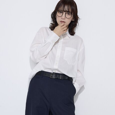 トップス下からシャツテイルをのぞかせるスタイリングも楽しめます。