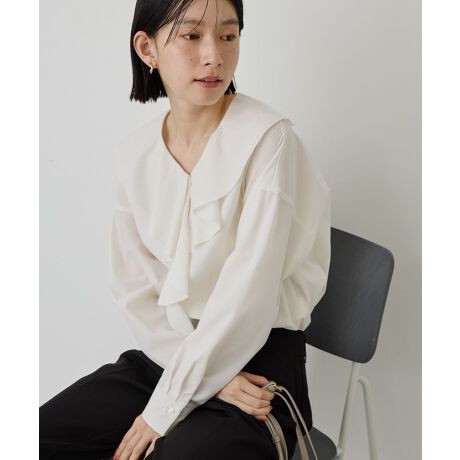 顔まわりを華やかに見せる大きめのラッフルデザインがポイントのブラウス。程よい柔らかさがあり、ゆったりと着られる一枚です。アイボリーはジャケットやジレとレイヤードしてトレンド感のあるオケージョンスタイルに、ストライプはシンプルなボトムスと合わせてカジュアルダウンするのもおすすめです。
