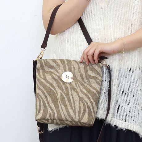 夏らしい麻風素材にゼブラの箔プリントが大人っぽいショルダーバッグ