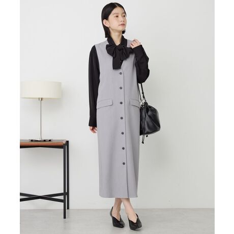ノーカラーのロングジレとしても、Iラインのワンピースとしても着られる着回し力抜群の2WAY仕様のアイテム。程よい厚みで体のラインを拾わず、どんなインナーにも合わせやすいデザインです。デイリーからオケージョンまで幅広く活躍します。