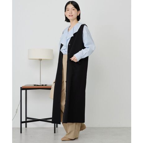 ノーカラーのロングジレとしても、Iラインのワンピースとしても着られる着回し力抜群の2WAY仕様のアイテム。程よい厚みで体のラインを拾わず、どんなインナーにも合わせやすいデザインです。デイリーからオケージョンまで幅広く活躍します。