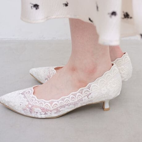 繊細なレース素材を使用した、軽やかな雰囲気のパンプス。