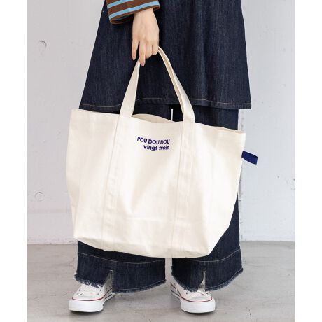 POU DOU DOU vingt-troisブランドロゴ刺繍を入れたオックス素材のトートバッグです。使い込むごとに馴染んで味が出てきます。バッグカラーごとに変えたロゴカラーや脇にはさんだタブがポイント。キーホルダーや缶バッジを付けて自分らしくカスタマイズを楽しめます。反対側と内側にポケットをつけました。