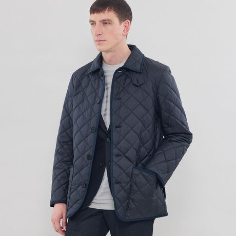 シグネチャーモデル〈WATSON〉のキルティングアウター。襟はコーデュロイを省き、へリンボンテープでパイピングを施すことで、シンプルかつモダンな佇まいに仕上げました。