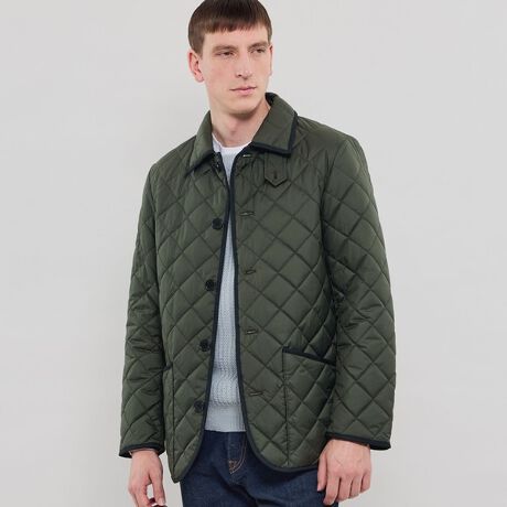 シグネチャーモデル〈WATSON〉のキルティングアウター。襟はコーデュロイを省き、へリンボンテープでパイピングを施すことで、シンプルかつモダンな佇まいに仕上げました。