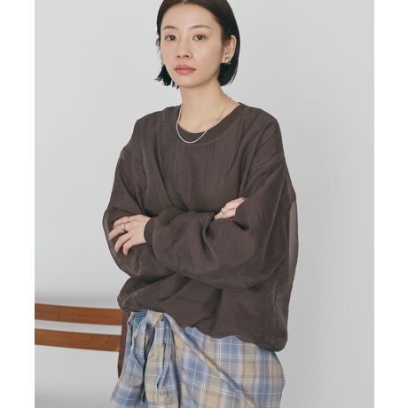 異素材のコントラストが洒落感溢れるデザインプルオーバー。スウェット素材のクルーネックフォルムに光沢感のあるオーガンジー素材を重ね、カジュアルさとフェミニンさを兼ね備えたこなれたデザインが魅力です。ゆとりのあるサイズで着心地よく、インナーにシャツを合わせた着こなしもおすすめ。スカートからスラックスまで幅広いボトムと合わせやすく、デイリーに活躍するおすすめのアイテムです。透け感[なし]