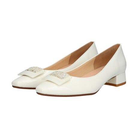 グリッターがあしらわれたスクエア型パーツがアクセントになり、足元にさりげない華やかさを添えるパンプスです。