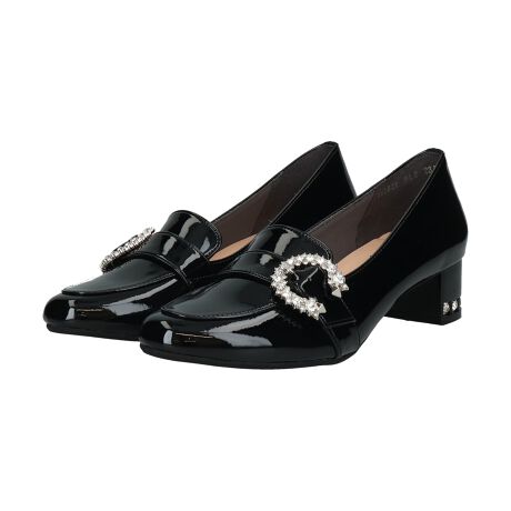丸いフォルムのビジューバックルが大人かわいいアクセントになり、上品な華やかさを添えてくれるパンプスです。