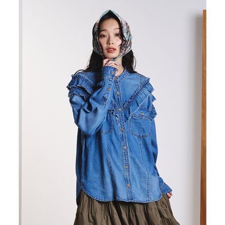 ROSE BUDらしいフリル使いがポイントで、定番のデニムシャツとは一味違う印象です。