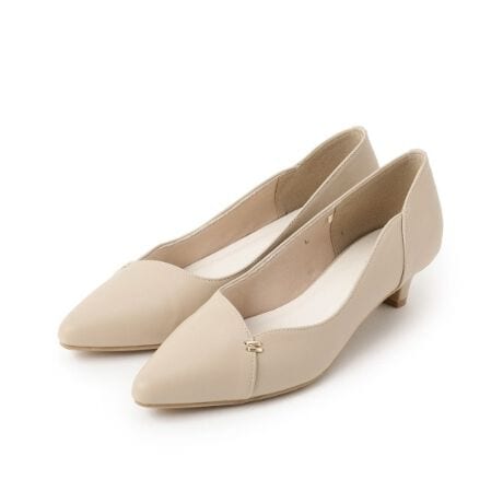 Vカットの上品なカッティングとメタルパーツがポイントのパンプス。