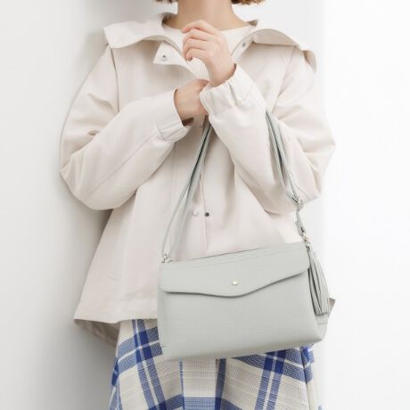 フロントのフラップが目を引く、軽やかなショルダーバッグ。