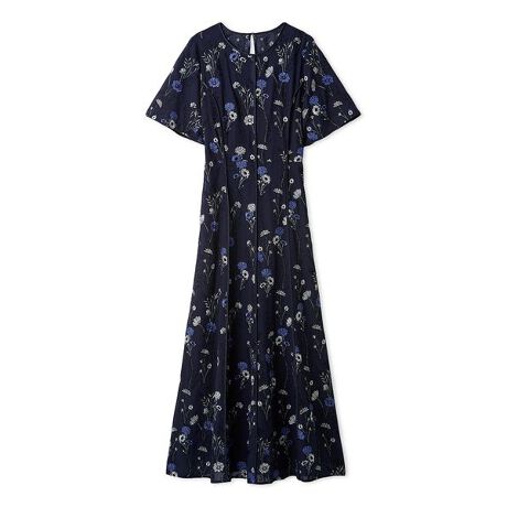 エレガントなエンブロイダリードレスは、シフォン生地に光沢を帯びた糸でボタニカルフラワーを描いたクチュール感漂うデザイン。