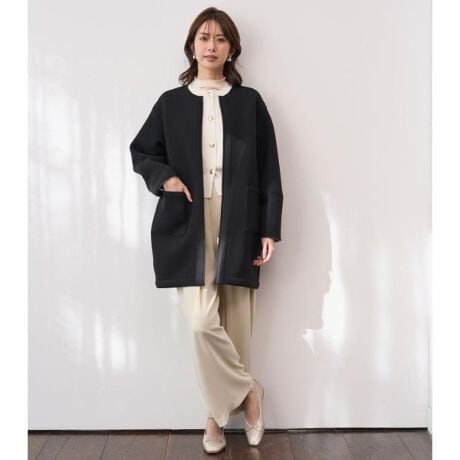 ・シンプルなノーカラーで、クルーネックデザインのミドル丈コート。