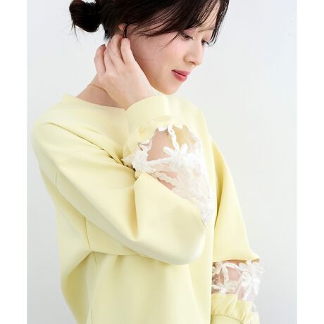 立体的なレースを袖に切り替えたダンボールスウェット
