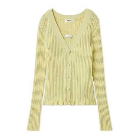 カーディガンは使いやすいベーシックなVネックで、大きめなパールボタンをアクセントに。