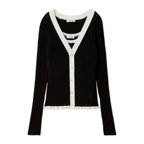 カーディガンは使いやすいベーシックなVネックで、大きめなパールボタンをアクセントに。
