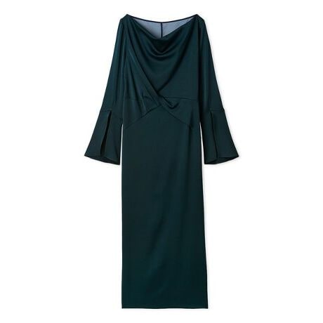 また、深めのスリットを入れたムードある袖や体に付かず離れずのすっきりとしたストレートシルエットも素敵見えをアシスト。