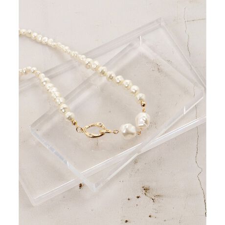 [型番:3160108004]ゴールドのニュアンスモチーフと、大小さまざまなパールを組み合わせたネックレス。異なる表情のパーツが重なり合い、奥行きのあるデザインに仕上げています。首元に存在感をプラスし、スタイリングを上品に引き立ててくれるアイテムです。