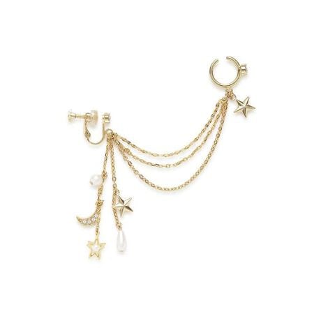 さまざまな形の月や星のチャームが揺れる、幻想的なデザインのイヤリング。カットの入った反射が美しいチェーンで流れ星を表現し、パールやクリスタルを散りばめて華やかさをプラス。耳元で輝くロマンティックなデザインです。