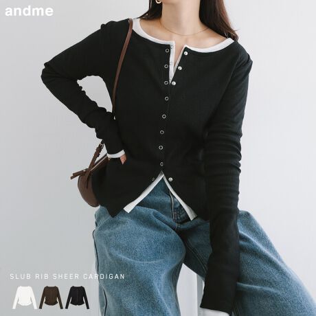 スラブリブ 長袖 シアー カーディガン トップス