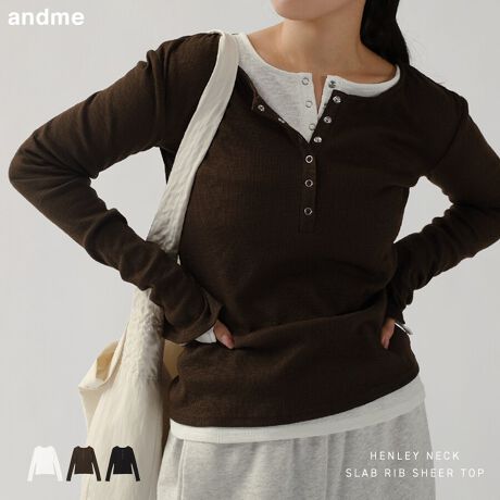 ヘンリーネック スラブリブ 長袖 シアー トップス