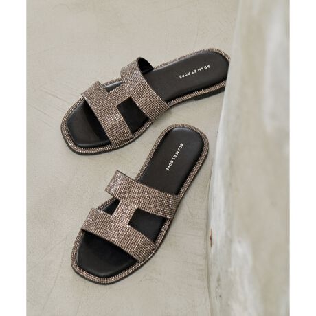 きらびやかで繊細なラインストーンを贅沢に使用した、夏の日差しをきらきらと反射させて足元を彩ってくれる着脱しやすいフラットサンダル。
