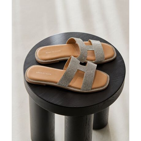 きらびやかで繊細なラインストーンを贅沢に使用した、夏の日差しをきらきらと反射させて足元を彩ってくれる着脱しやすいフラットサンダル。