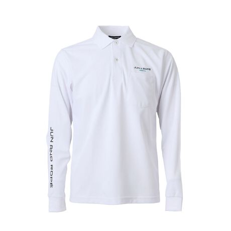 [型番:EJM56700]吸水速乾、UVカット機能をもつカノコ素材を使用。胸の配色ロゴ刺繍に配色カラーを合わせたボタンの付け糸を使用するなど、細部にもこだわった、シンプルかつ、一枚で着てもサマになる長袖ポロシャツ。
