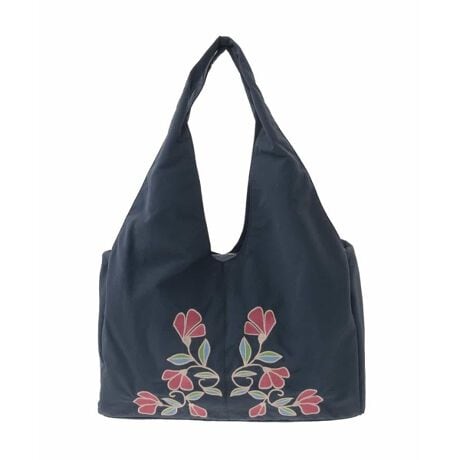 [型番:GG5DD30150]フラワー刺繍が目を惹くトートバッグ。サイドのポケットを充実させた、荷物の整理がしやすい実用的なデザインに仕上げました。ちらりと見える裏地の配色がさりげなく個性をプラス。軽やかなナイロン素材に肩掛けしやすい長めの持ち手でデイリーに使いやすく、コーディネートに女性らしさを添えてくれるオススメアイテムです。