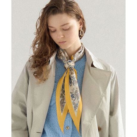 イタリアErica社の上質なキャラコプリントを、使いやすいダイヤ型のシルクスカーフに仕立てました。上質なシルクを100%使用しており、肌に吸い付くような滑らかな手触りと、上品な光沢感が魅力です。インド的なモチーフにインスパイアされたペイズリー柄は、繊細な輪郭と調和の取れた配色が特徴で、装いに優雅なアクセントを添えます。首元に巻けば顔周りを華やかに、バッグのハンドルに結べば上品なポイントに、ヘアアレンジに加えてこなれ感を演出するなど、様々なスタイリングをお楽しみいただけます。シンプルなコーディネートにプラスするだけで、洗練された大人のスタイルが完成します。 カラーは、イエローの縁取りが印象的で明るく華やかなアイボリー(#502)と、ライトブルーの縁取りが爽やかで洗練された雰囲気のサックス(#572)の2色展開です。