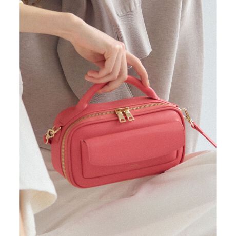 フロントのフラップポケットがデザインのポイントとなる、ミニマルな2WAYバッグです。素材はフェイクレザーを使用しておりコンパクトなサイズ感ながら、お出かけに必要なものがしっかり収まる普段使いに最適な大きさです。トップハンドルで手持ちスタイルを楽しめるほか、付属のショルダーストラップを使えば肩掛けや斜め掛けも可能。両手が空くので、ショッピングや旅行などアクティブなシーンにも活躍します。フロントに配されたフラップポケットは、デザインのアクセントになるだけでなく、パスケースやリップなど、すぐに取り出したい小物の収納に大変便利です。本体をぐるりと囲むダブルファスナーは、開口部が大きく開き、荷物の出し入れをスムーズに行えます。カラーは、どんなスタイルにも合わせやすい定番のブラック(#005)、華やかなアクセントカラーのピンク(#012)、上品で落ち着いた印象を与えるシーズンレスなキャメル(#034)の3色展開です。