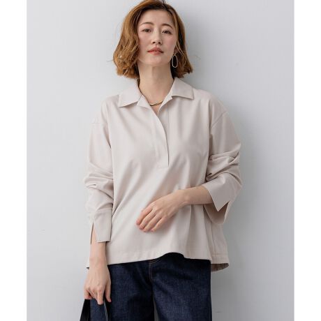 ゆったりとしたシルエットが特徴のスキッパートップスです。深めのVネックが顔周りをすっきりと見せ、抜け感を演出します。襟やカフスはしっかりとした仕立てで、マニッシュな印象をプラス。一方で、裾にはドロストが施されており、キュッと絞れば丸みのあるシルエットに、そのまま着ればリラックス感のある着こなしにと、気分やコーディネートに合わせてシルエットのアレンジが楽しめます。カットソー素材でありながら、布帛のような上品な表情を持ち、シワを気にせず快適にお召しいただけます。 一枚で着るのはもちろん、シアーなタートルネックやフェミニンなレースインナーを重ね着すれば、より洗練された印象に。オフィスシーンから休日のカジュアルスタイルまで、幅広いシーンで活躍する大人なシルエットトップスです。 カラーは、着回し力抜群でシックな印象のブラック(#005)と、上品で柔らかな雰囲気を醸し出すベージュ(#033)の2色展開です。