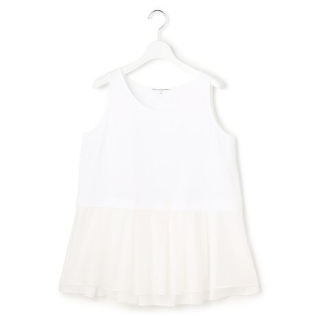 裾にシアーな素材をドッキングした、洗練されたレイヤードデザインのトップスです。2枚重ねでたっぷりと分量をとったペプラムが、気になる腰回りを優しくカバーしながら、足元をすっきりと見せてくれます。ニットやカーディガンの裾からペプラム部分をのぞかせれば、コーディネートにこなれ感をプラス。着回し力抜群で、オフィススタイルや休日のカジュアルスタイルまで、幅広く活躍する一枚です。カラーは、清潔感あふれるホワイト(#001)と、シックで着回し力抜群のブラック(#005)の2色展開です。