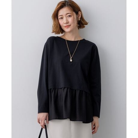 裾にさりげない透け感のあるシアー素材を切り替えた、今年らしいレイヤードデザインのトップスです。お手持ちのニットやスウェットの裾からのぞかせるだけで、いつものコーディネートがぐっとこなれた印象に。一枚で着るだけでなく、重ね着のアクセントとしても活躍し、着こなしに奥行きとトレンド感をプラスします。シンプルなボトムスに合わせるだけで、洗練された大人のカジュアルスタイルが完成します。オフィスシーンではジャケットのインナーとして、オフシーンではカジュアルなトップスと重ねて、幅広いスタイリングをお楽しみいただけます。カラーは、クリーンで万能なホワイト(#001)、着回し力抜群でシックなブラック(#005)、上品で肌なじみの良いベージュ(#033)の3色展開です。