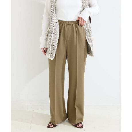 シボ感が特徴のアムンゼン調の表面感でカジュアルすぎず、こなれた素材感が特徴。膝で少し絞りを入れた緩めのフレア型にタックではなく、つまみピンタックにして、脚のラインも拾いにくく、堅苦しさのないON/OFF兼用できる万能パンツです。