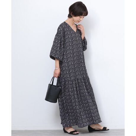 繊細なフラワープリントを全面にあしらった、落ち感のあるクレープ素材のギャザーワンピースです。