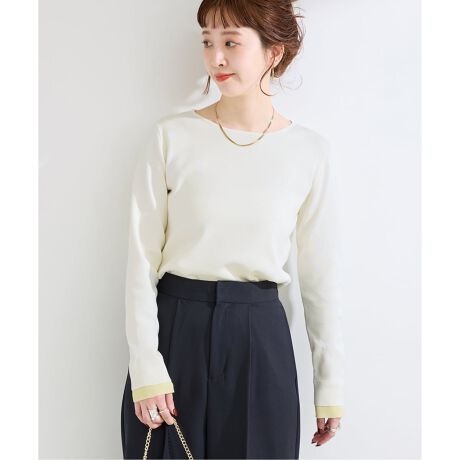 春夏に向けて程よくドライタッチな風合いが特徴です。衿ぐりは開きすぎないボートネックにし、袖口は今年らしく重ね着して見える配色使いにしています。