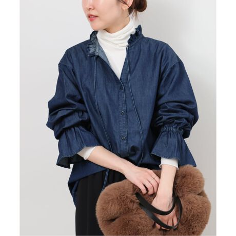 ◆カジュアルな薄手デニムにフリルをプラスしたブラウス。