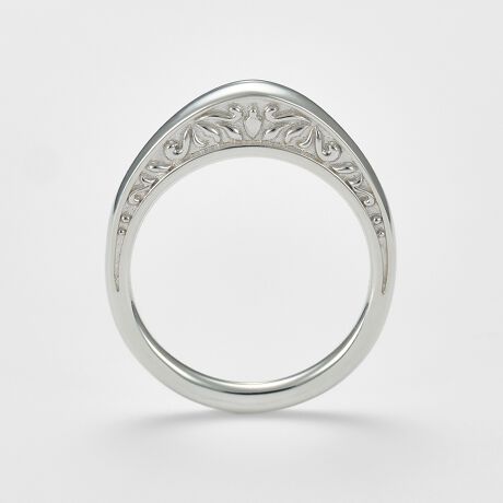 程よい高さを持たせた立体的なフォルムが印象的なリングシリーズです。どの角度から眺めても美しく映えるよう、細部にまで丁寧にデザインされています。側面にはヴィンテージの趣を感じさせるレリーフ模様をあしらい、モダンな雰囲気と調和させました。正面はあくまでもベーシックに仕上げているため、主張しすぎることなく、幅広いスタイルに自然と馴染みます。重ね着けすることで、より奥行きのある表情をお楽しみいただけます。※サイズ直しプラスマイナス1号迄。