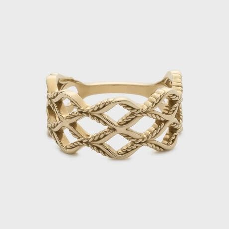 【Soft Gold Series】バスケットをイメージして抜け感たっぷりにデザインした透かしのピンキーリング。プレーンな線とツイストの線で柔らかく編み込まれたシルエットは、少しだけ歪なクラフト感を添えて優しい印象に仕上げました。幅がありつつも軽やかなボリュームは、細身のリングとのコーディネートにもおすすめです。※天然石や天然素材を使用しているものは、サイズ・色味・風合いの違いや、若干の傷、内包物の有無などに個体差があります。予めご了承ください。※サイズ直し不可。※肌なじみのいいソフトゴールドカラーのコーティングを使用しています。