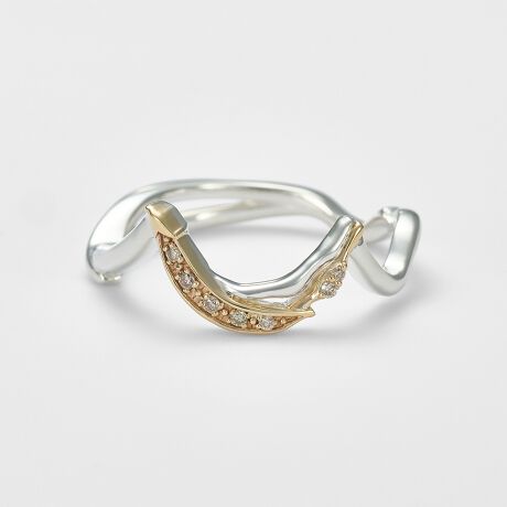 大きく動きをつけたラインが、新しい未来への期待や高揚感を表現する地金リング。K10とシルバーのコンビネーションが、指先にこなれた雰囲気を添えます。ゴールド部分には、さりげなく“えんどう豆”のモチーフをあしらいました。えんどう豆は「未来の幸せ」「続く楽しみ」といった花言葉を持ち、古くから愛されるラッキーモチーフです。カーブに沿って一粒石のリングを重ねるスタイリングもおすすめです。※天然石や天然素材を使用しているものは、サイズ・色味・風合いの違いや、若干の傷、内包物の有無などに個体差があります。予めご了承ください。