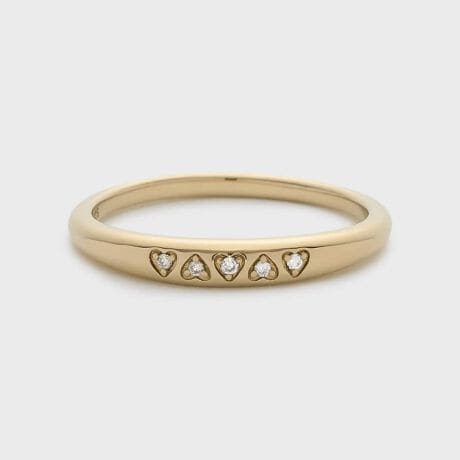【Soft Gold Series】新しい季節の気配に期待が膨らむ、胸の高鳴りをイメージして並べた小さなハートシルエットの中にダイヤモンドが輝くリング。上下に向きを変えながらリズミカルに並ぶハートと5石のダイヤモンドを掛け合わせることで、ベーシックなフォルムの中に遊び心を添えました。ふっくらとしたラインが手元を優しく印象付けます。※天然石や天然素材を使用しているものは、サイズ・色味・風合いの違いや、若干の傷、内包物の有無などに個体差があります。予めご了承ください。※肌なじみのいいソフトゴールドカラーのコーティングを使用しています。※サイズ直し不可。