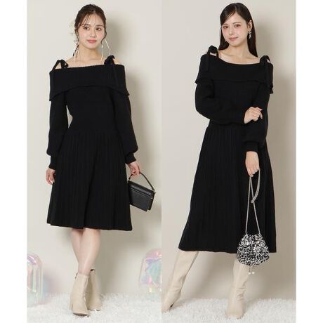 オープンショルダープリーツニットワンピース